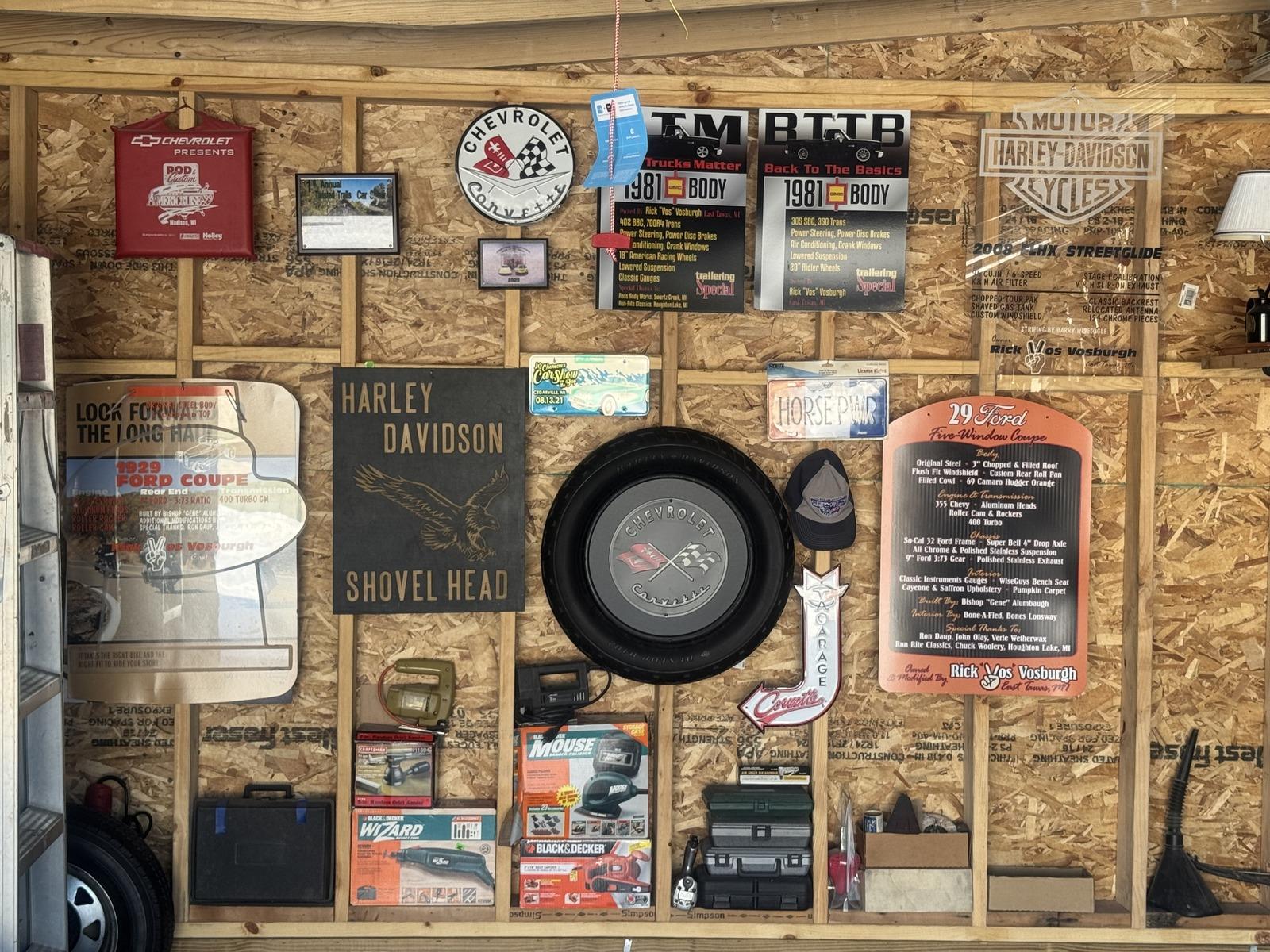 To the right of the yellow Ledsled was more cars! They are being worked on, or have plans to be worked on, but right behind it was this stunning gasser. It’s a 1955 Gasser that most will recognize because he still races it TODAY! Actually, Arron Swett is the driver, but it is at Lapeer Dragway often. This car is over the top, right down to the mini replica of it in a matchbox car in plastic case. The paintjob, the engine, this is ONE LOUD puppy! It’s his favorite car he has ever owned. You can tell he has a lot of pride in it. We talked about it for a long time.